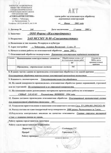 Акт сдачи работ на огнезащитную обработку деревянных конструкций для заказчика ООО Фирма "Жилстойтранс" . Огнезащитной обработке подвергались деревянные конструкции чердачного помещения. Обработка производилась по неокрашенной и не строганной поверхности, составом Огнезащитный пропиточный для поверхностной обработки древесины - МС. Работы произведены на основании руководящих материалов по огнезащите СНиП 2.01.02-85 Руководства ВНИИПО 1999г.