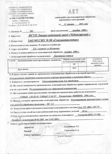 Акт сдачи работ на огнезащитную обработку деревянных конструкций для заказчика ФГУП Ликеро-водочный завод "Чебоксарский". Огнезащитной обработке подвергались деревянные детали ТД "Акатуй". Обработка производилась по неокрашенной и не строганной поверхности, составом Огнезащитный пропиточный для поверхностной обработки древесины - МС1;1. Работы произведены на основании руководящих материалов по огнезащите СНиП 2.01.02-85 СНиП 21-01-97 Руководства ВНИИПО 1994г.