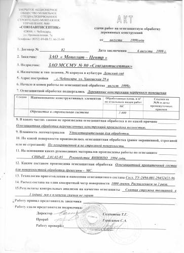 Акт сдачи работ на огнезащитную обработку деревянных конструкций для заказчика ЗАО "Монолит-Центр". Огнезащитной обработке подвергались деревянные конструкции чердачного помещения. Обработка производилась по неокрашенной и не строганной поверхности, составом Огнезащитный пропиточный для поверхностной обработки древесины - МС. Работы произведены на основании руководящих материалов по огнезащите СНиП 2.01.02-85 Руководства ВНИИПО 1994г.