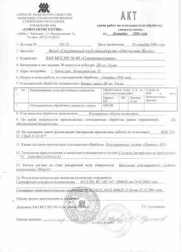 Акт сдачи работ на огнезащитную обработку занавеса сцены для заказчика Фонд "Спортивный клуб единоборств Отечество-Волга". Была проведена работа по огнезащитной обработке занавеса сцены ДК им.Ухсая. Обработка проводилась по обеспыленной поверхности, огнезащитным составом "Нортекс-КП". Работы произведены на основании руководящих материалов НПБ 244-97, СНиП 21-01-97*.