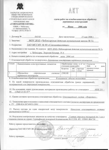 Акт сдачи работ на огнезащитную обработку деревянных конструкций для заказчика МОУ ДОД "Чебоксарская детская музыкальная школа №5". Огнезащитной обработке подвергались деревянные конструкции чердачного помещения. Обработка производилась по неокрашенной и не строганной поверхности, составом Огнезащитный состав "Вупротек". Работы произведены на основании руководящих материалов НПБ 251-98, СНиП 21-01-97*. Результаты контрольных анализов на качество огнезащиты показали что снятая стружка толщиной 1 мм в пламени спички не горит. Сертификат пожарной безопасности №ССПБ.RU.УП001.В04756