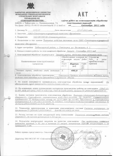 Акт сдачи работ на огнезащитную обработку текстильных изделий для заказчика ОАО Санитарно-курортный комплекс «Волжанка». Огнезащитной обработке подвергался занавес сцены и отделка стен актового зала. Обработка производилась по обеспыленной сухой поверхности текстильного изделия, составом Биопирен (Антипирен-Антисептик)"Нортекс-С", Сертификат соответствия С-RU.ПБ31.В.00048, ТР 0628747, соответствует требованиям ТР Федерального закона от 22.07.2008.№123-Ф3, приложение к сертификату соответствия №С-RU,№0053665, санитарно-эпидемиологическое заключение №18.УЦ.02.249.П.000.12.09 №2824118. Работы произведены на основании руководящих материалов СНиП 21-01-97*,НПБ 257-002,ГОСТ Р 50810-95, ГОСТ Р 53294-20009, согласно ТУ 2499-007-24505934-01. Результаты контрольных анализов показали что при воздействии пламенем зажигалки высотой 40 мм в течении 15 секунд, остаточное горение отсутствует и не превышает 5 сек.