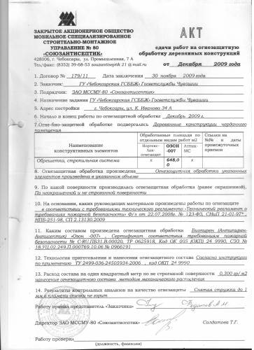 Акт сдачи работ на огнезащитную обработку деревянных конструкций для заказчика ГУ "Чебоксарская ГСББЖ" Госветслужбы Чувашии. Огнезащитной обработке подвергались деревянные конструкции чердачного помещения. Обработка производилась по неокрашенной и не строганной поверхности, составом Биопирен(Антипирен-Антисептик),Озон-007,Сертификат пожарной безопасности С-RU.ПБ31.В.00020,ТР 0625918,код ОК005(ОКП)24 9990,СЭЗ № 18.УЦ.02.249.П.00769.10.69.№0966191. Результаты контрольных анализов на качество огнезащиты показали что снятая стружка до 1 мм в пламени спички не горит.
