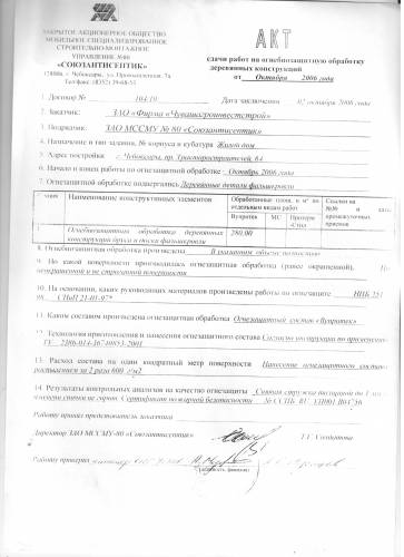 Акт сдачи работ на огнезащитную обработку деревянных конструкций для заказчика ЗАО Фирма "Чувашагроинвестстрой". Огнезащитной обработке подвергались деревянные детали фальшкровли жилого дома. Обработка производилась по неокрашенной и не строганной поверхности, огнезащитным пропиточным составом Вупротек. Работы произведены на основании руководящих материалов СНиП 21-01-97*, НПБ-251-98. Результаты контрольных анализов на качество огнезащиты показали что снятая стружка толщиной 1 мм в пламени спички не горит.Сертификат пожарной безопасности №ССПБ.RU.УП001.В04756