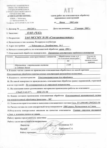 Акт сдачи работ на огнезащитную обработку деревянных конструкций для заказчика ОАО "ЧАЗ". Огнезащитной обработке подвергались деревянные конструкции чердачного помещения. Обработка производилась по неокрашенной и не строганной поверхности, огнезащитным пропиточным составом для поверхностной обработки древесины - МС. Работы произведены на основании руководящих материалов СНиП 21-01-97*, НПБ-251-98. Результаты контрольных анализов на качество огнезащиты показали что снятая стружка толщиной 1 мм в пламени спички не горит.