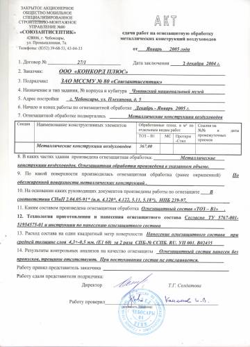 Акт сдачи работ на огнезащитную обработку металлических конструкций воздуховодов для заказчика ООО "КОНКОРД ПЛЮС". Была проведена работа по огнезащитной обработке металлических конструкций воздуховодов Чувашского национального музея. Обработка проводилась по обезжиренной поверхности металлических конструкций составом Огнезащитный состав "ТОЗ -В1". Работы произведены на основании документов: СНиП 2.04.05-91*(п.п 4.122, 5.11, 5.18*), НПБ 239-97. Результаты контрольных анализов показали что огнезащитный состав нанесен без пропусков, трещины отсутствуют. При постукивании состав не отслаивается.