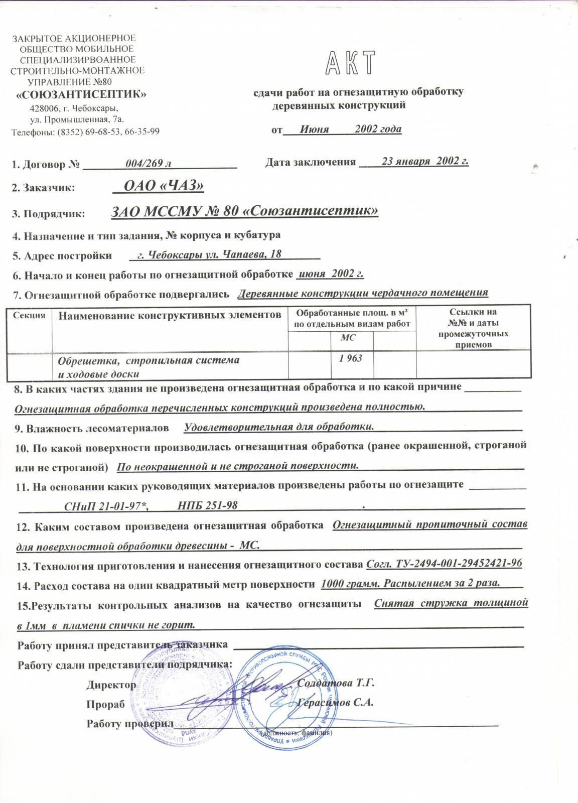Акт сдачи работ на огнезащитную обработку деревянных конструкций для заказчика ОАО "ЧАЗ". Огнебиозащитной обработке п...