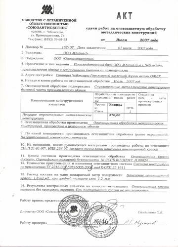 Акт сдачи работ на огнезащитную обработку металлических конструкций для заказчика ООО "Юнона-2" была проведена работа по огнезащитной обработке строительных металлических конструкций бытовой части промышленного здания. Обработка проводилась по грунтованной поверхности метала, краской огнезащитная "Аквест". Сертификат пожарной безопасности №ССПБ.RU.ОП047.Н.00024. Работы произведены на основании руководящих материалов СНиП 21-01-97*, НПБ-236-97 согласно технологии нанесения огнезащитной краски. Результаты контрольных анализов показали что огнезащитная краска нанесена без пропусков, трещин. При постукивании краска не отслаивается.